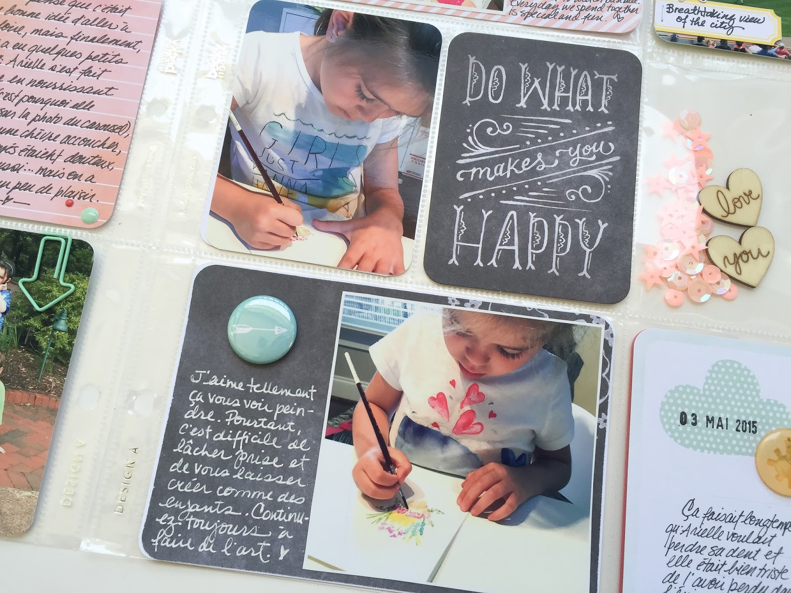 Voici ma page et ses gros plans. Vous pouvez aller lire chez GEt it Scrapped ce que j'ai écrit sur le Flow et le Focus. Peut-être que vous découvrirez quelques trucs qui rendront votre prochaine page à pochettes plus intéressante?! :)