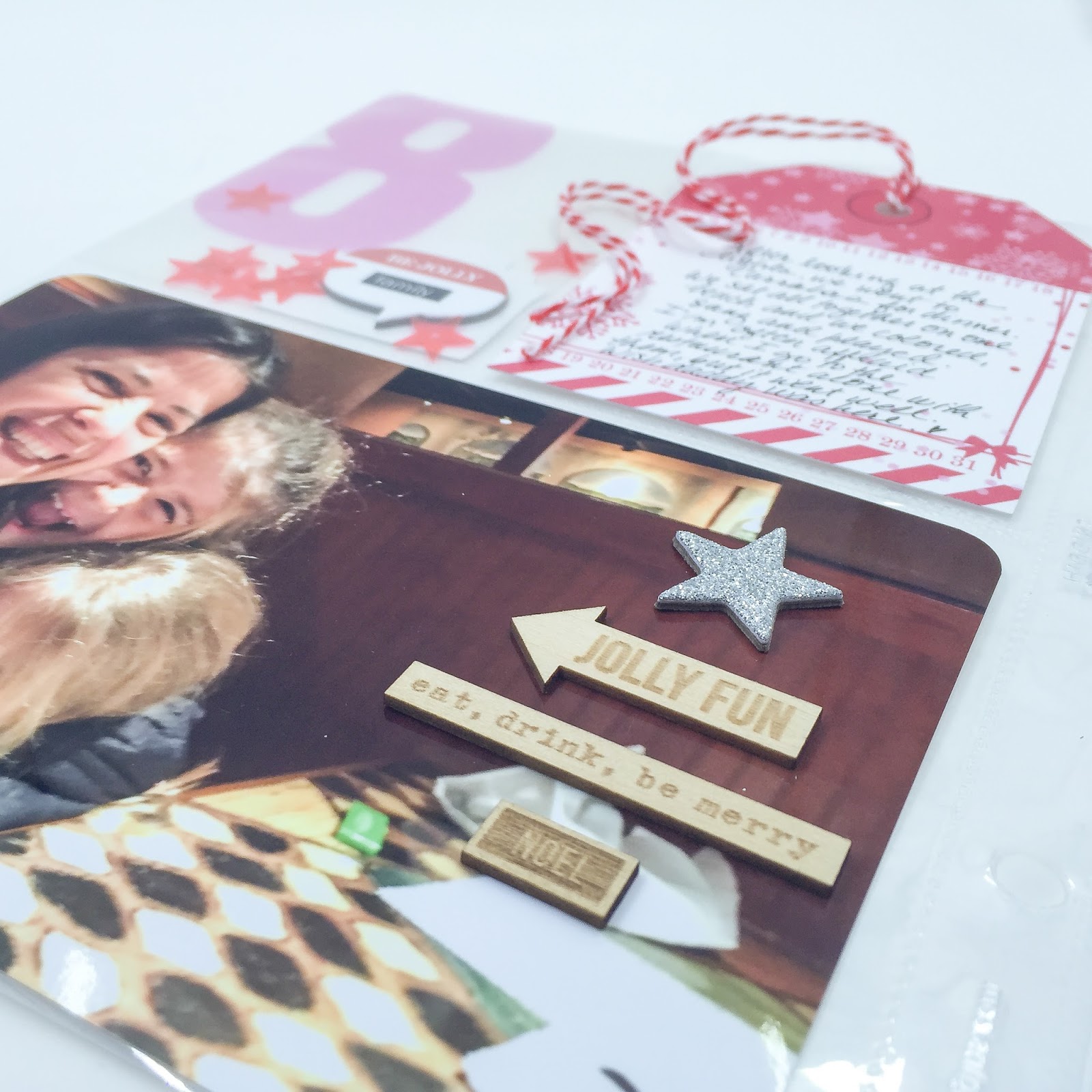 Sur cette dernière photo j'ai utilisé des wood veneers de Citrus Twist Kits et une étoile en chipboard de Ali Edwards. J'ai commencé par coller le Jolly Fun puis le eat, drink, be merry et quand j,ai mis l'étoile je me suis rendue compte que ca formait presqu'un sapin de noel alors j'ai ajouté le "tronc" Noel. :) C'est un des avantages d'avoir beaucoup de produits sous la main.